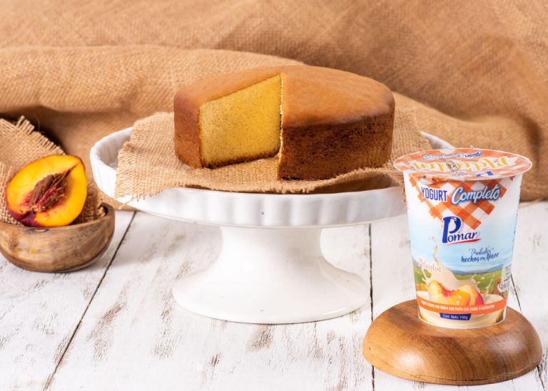 - Retirar esta mezcla de la batidora y suave y manualmente agregar la harina y el polvo de hornear previamente cernidos, alternando con el yogurt de melocotón Pomar al que se le agregó ya la vainilla. Realizar este proceso hasta terminar.